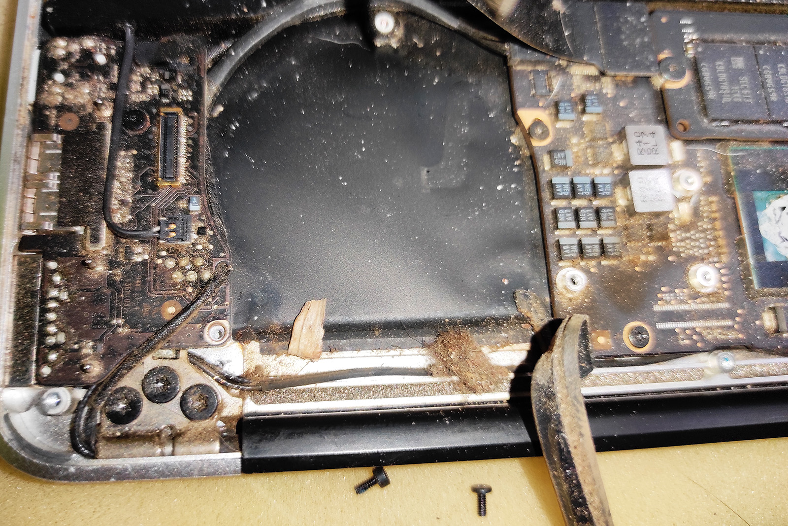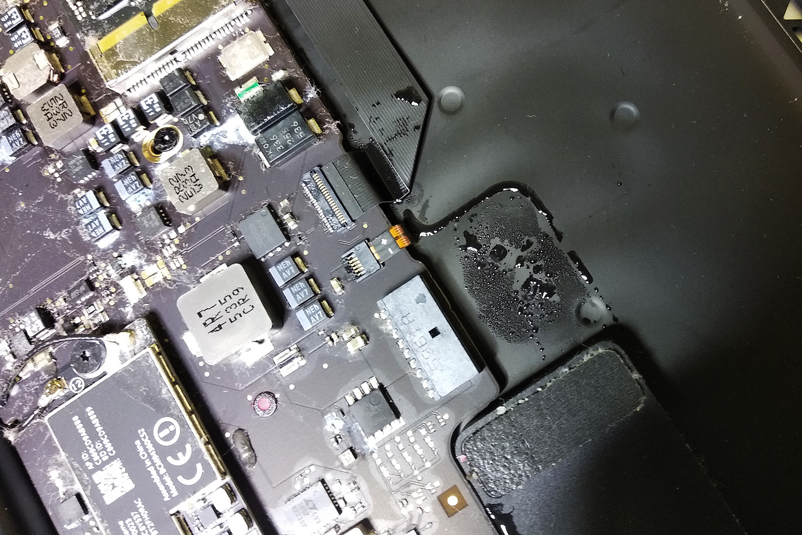 MacBook po zalaniu kawą – czyszczenie płyty i naprawa po zwarciu